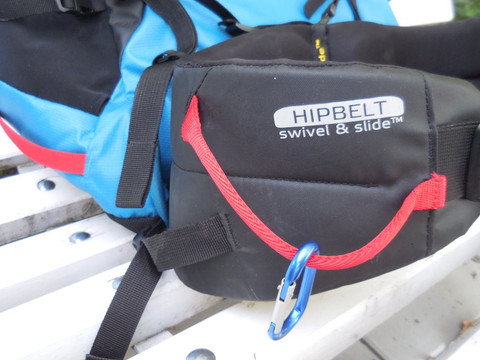 Na bederáku jsou dvě materiálová poutka, která jsem zkoušel pro nesení karabin se smycemi a prusíky. V NoSLech nemáme klasické sedáky, ale jen smyce 150 cm pro provedení nouzového sedáku a na ten si nic nezavěsíte, takže materiálové poutka na batohu by se opravdu hodila v případě, že by došlo na navázání se.