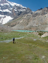 Kousek pod cestou je mezi balvany několik míst pro stany, Ale je to daleko k vodě. Hledáme lepší. Obcházím jezero po směru hodinových ručiček. Přeskákat kamenolom, ale to by se mi s báglem nechtělo. Podmáčené bláto s přitékajícím potůčkem a sněhový svah až do vody. Probrodím měkkým sněhem a dostávám se na štěrkovou pláž, kde se rozlévá voda z ledovce Mirali. Podél břehu jde přeskákat po kamenech. V rohu jezera odděluje kamenná hrázka druhé, menší jezírko. Vyskládané kameny jsou pokračováním pěšiny z druhého břehu.