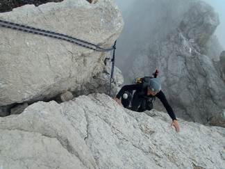 Výšvih na hřeben vypadal horší, než je. Sem tam červený flek na skále, občas mužíček, díky nimž víme, kudy jít. V podstatě cik-cak po policích a terasách. Jde se pohodlně, ale samozřejmě to vyžaduje jistou dávku opatrnosti. Za mokra by to byla jiná pohádka.