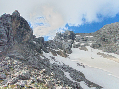 Dál už jen suť a první sněhové pole. Za ním je terasovitá skála, která nás podle popisu čeká. Traverzujeme k ní šikmo vzhůru. Zatím jdeme bez maček, ale raději s cepíny v ruce. Přeci jen je to dolů celkem sešup. Německé trio se nechá předejít a chvíli pokračuje v našich stopách. Mačky s sebou vůbec nemají. Už jsme dávno na skále a oni pořád cosi řeší na sněhu. Zbytek dne už je nepotkáme.