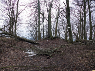 Další potenciální vyhlídkou je kopec Sokol se zbytky hradu. Ženu se nahoru, zatímco Johny strategicky zůstává u přístřešku na odbočce a vaří čaj z přilehlé studánky. Cesta je skoro až nahoru rozrytá lesní technikou. Bláta, že by jeden utopil i holínky. Hopsám pruhem sněhu podél lesa, abych se za odměnu rozhlédla do vzrostlých stromů. Z hradiště se dochovalo pár základových zdí, na nichž leží padlé kmeny.