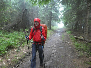 Včera jsem si toužila chladit nohy v potoce, tak mám, co jsem chtěla. V každé botě mi šplouchá osobní bazén. Jak se les otevírá....ne, nebudou výhledy....přidává se vítr. Matně rozlišujeme obrysy budovy. To znamená, že jsme na vrcholu a jdeme se ohřát do chaty Emila Zátopka. Horká česnečka a čaj spraví náladu. Za oknem jako kdyby nalepili šedý papír. Potřebujeme aspoň sejít do Ostravice. Johny hledá penzion. Když zjistím, že mi odfoukl kus pláštěnky z batohu a spacák v dolní kapce nasál několik litrů, souhlasím.