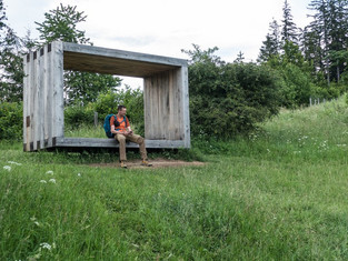 Krátkým prudkým stoupáním se dostaneme na hřeben u pozorovatelny Durch. Dřevěný rám by kryl proti vodě jen shora. Tři kilometry k rozhledně dojdeme. Trochu bláta, pár křížků, přehřátý vysílač a rekreační středisko necháme za sebou.