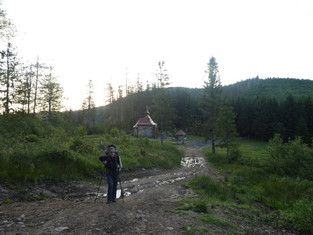 Přes Velký Polom vede pěšina borůvčím a divokým lesem. Večerní slunce dělá místo ještě krásnějším. A jak teprve krásně bude u té horské kapličky s jistě zázračným pramenem! Sesypeme se vymletou stezkou do travnatého sedla. Kaplička je poněkud větší, než bych čekala a kolem spousta dřevěných lavic. Dnes se tu konala výroční mše. To znamená, že u cesty se válí několik pytlů odpadků, kelímků od piva a plastových tácků od guláše. Zřejmě slušnej mejdan. Horší je, že jak se zastavíme, vrhne se na nás hejno mušek a komárů. Jsou všude. Část toho černého mračna se topí v ešusu. Fajn. Večeře s proteiny. Nepomáhá ani chodit dokolečka, ani nic. Vzduch se nehýbe. Hlavu do spacáku a snad to do rána zmizí.