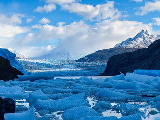 Oblast kolem ledovce a jezera Grey mám asi nejraději z celého treku. Proto si nenecháme ujít vyhlídku na zátoku, kam zrovna připlavala spousta ledových ker. Modrobílé tvary kontrastují s šedou hladinou. Dá se sejít až k vodě. Lákalo by zkusit po těch kusech ledu skákat, ale rozum vítězí… ikdyž těsně.