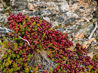 Cestou je dost zataženo a chladno, ale neprší, takže pohoda. Stoupáme a klesáme podél břehu jezera a na svačinovou pauzu marně hledáme nějaký krytý plácek. Aspoň že o vyhlídky není nouze. Po dvacet let starém požáru tu z vysokých stromů zbývají jen holé kmeny a mezi nimi nízká vegetace. Přeci jen tu všechno roste pomaleji. Podél cesty trháme drobné červené plody místní verze brusinek. Těch tady všude roste hromada.